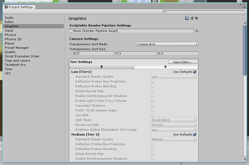 기존에는 Edit->Project Setting->Graphics->Transparency Sort Mode 를 Coustom Axis로 설정해